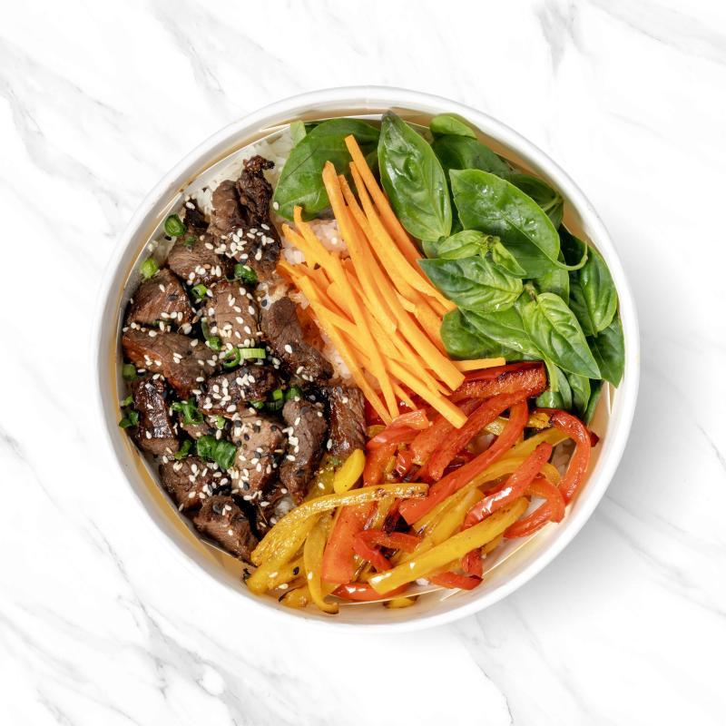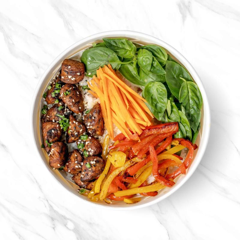 White rice, teriyaki beef, bell peppers, Italian basil, teriyaki sauce