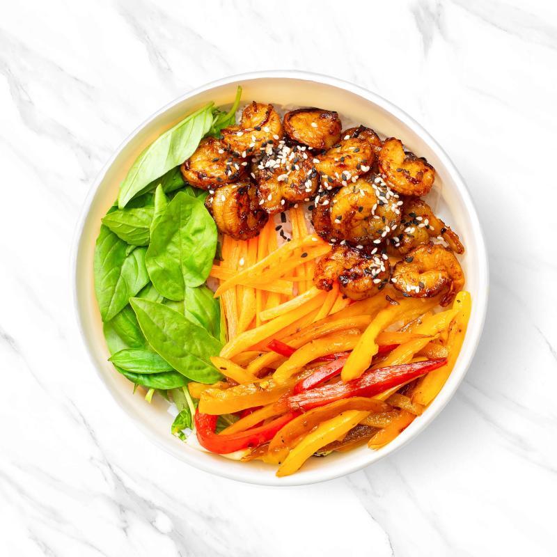 White rice, teriyaki shrimp, bell peppers, Italian basil, teriyaki sauce