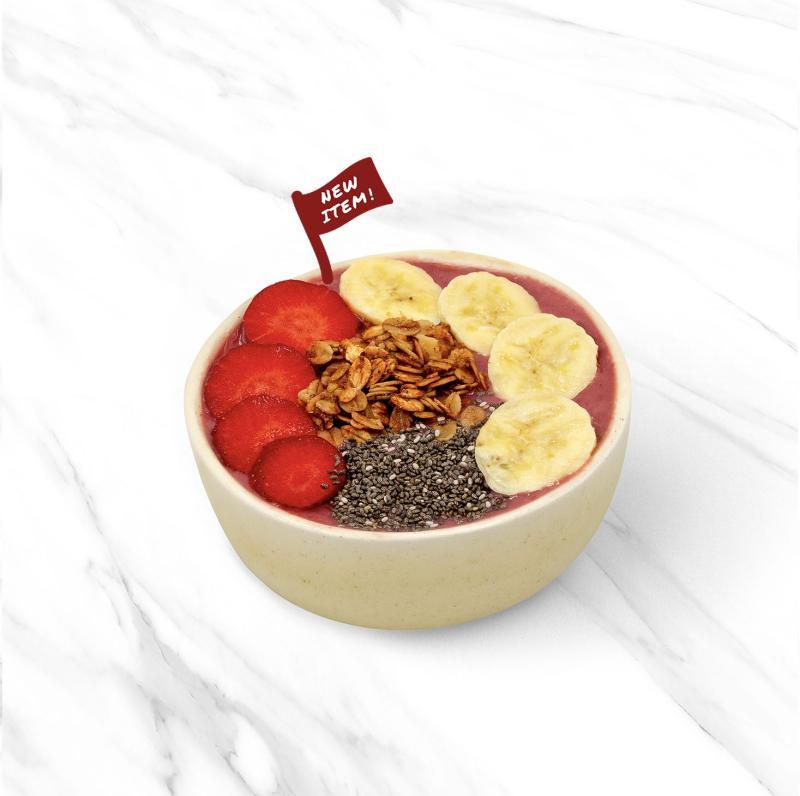 Raspberries, barberries, banana, strawberries, acai powder, strawberry topping,...