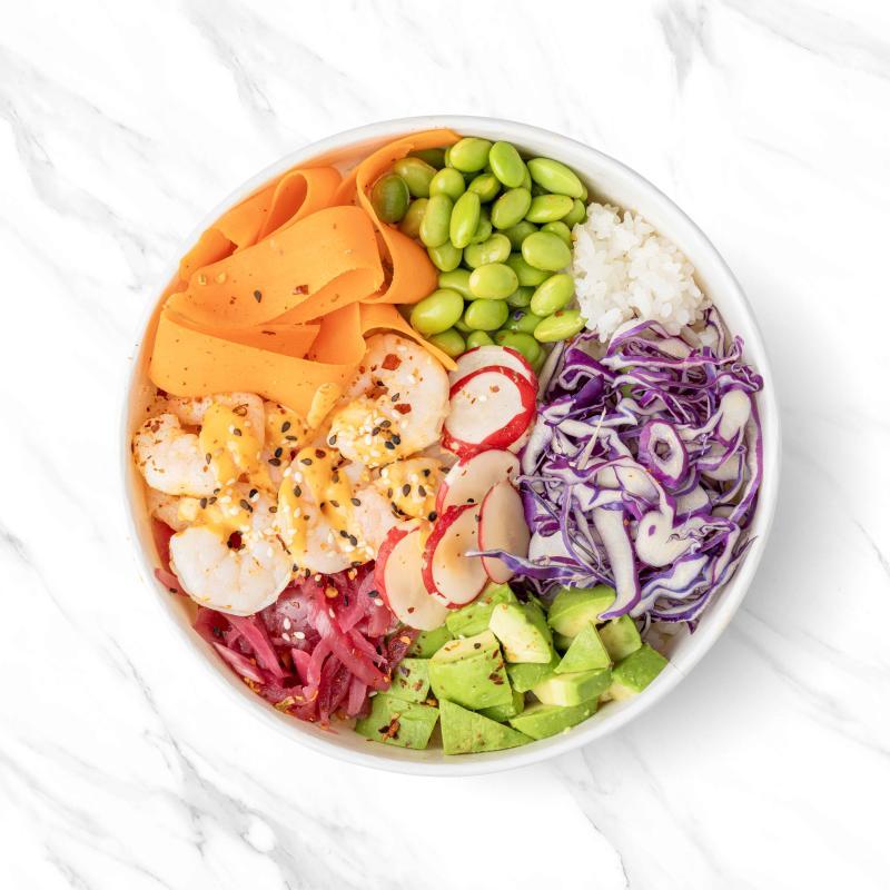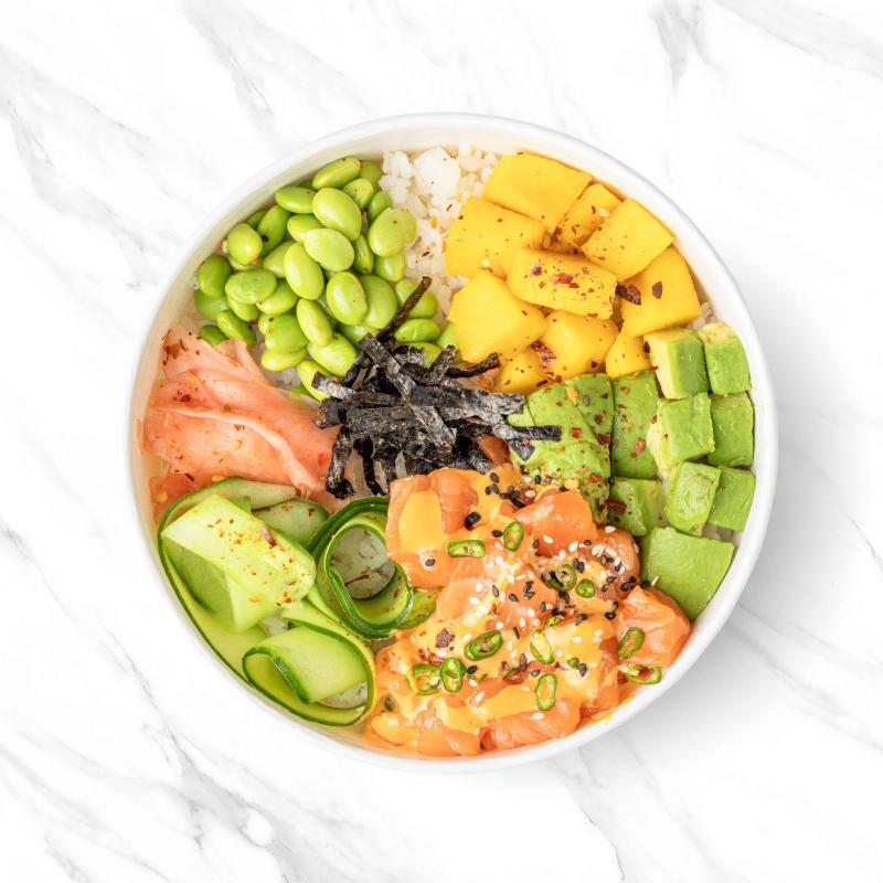 Salmon, sushi rice, avocado, mango, cucumber, jalapeño, edamame, nori, pickled g...
