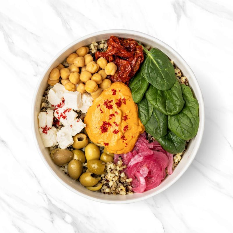 Quinoa, bulgur, sun-dried tomatoes, baby spinach, chickpeas, pickled onions, roa...