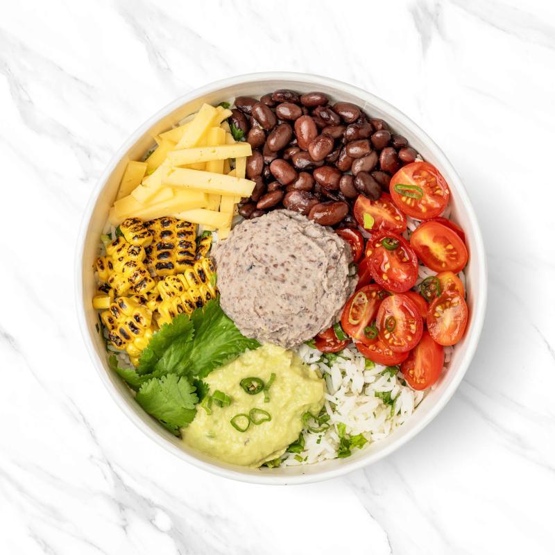 Brown rice with cilantro, cherry tomatoes, black beans, bean purée, avocado puré...
